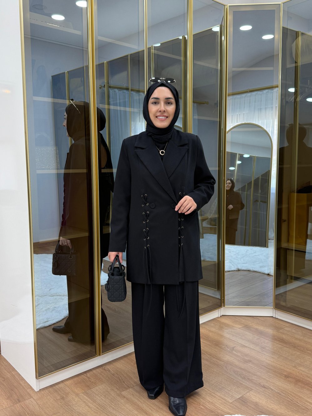 Pantolonun arka kısmı lastiklidir. Ön kısmı fermuar ve düğme detaylıdır.