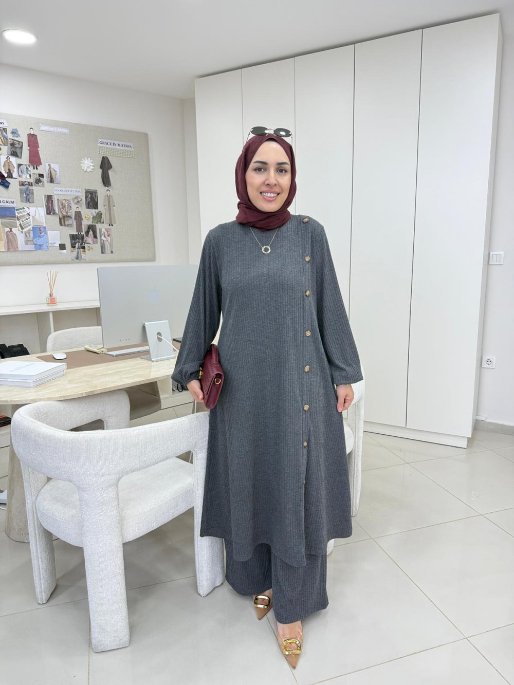 Tunik boy 120 cm’dir. Sol tarafında çubuk düğme detayı, bileklerinde lastik bulunmaktadır.