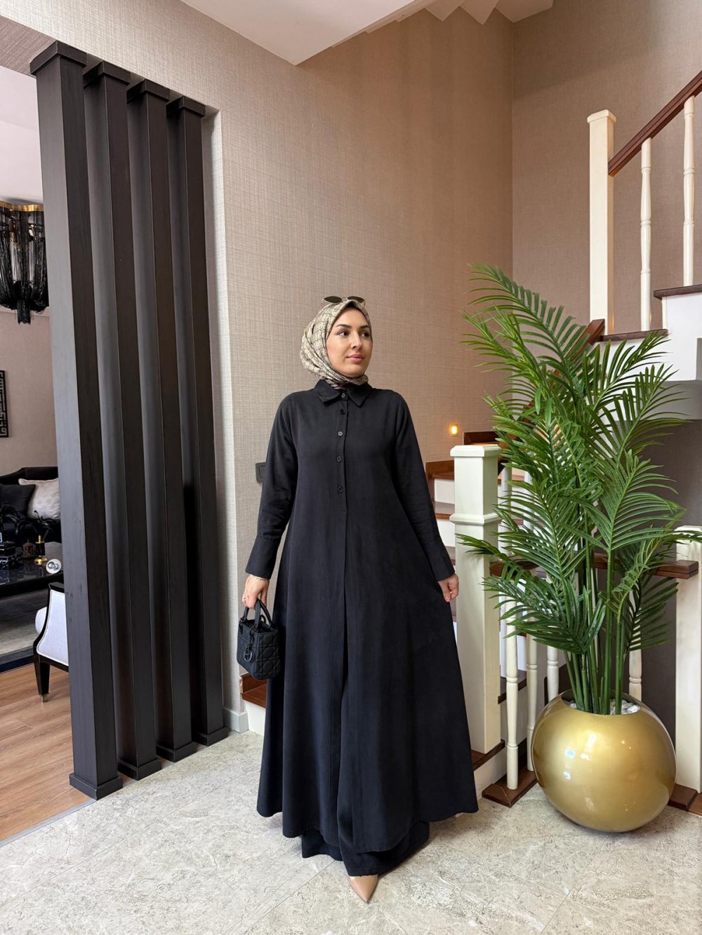 Tunik boy 138 cm’dir. Önde düğme ve yırtmaç detayı mevcuttur.