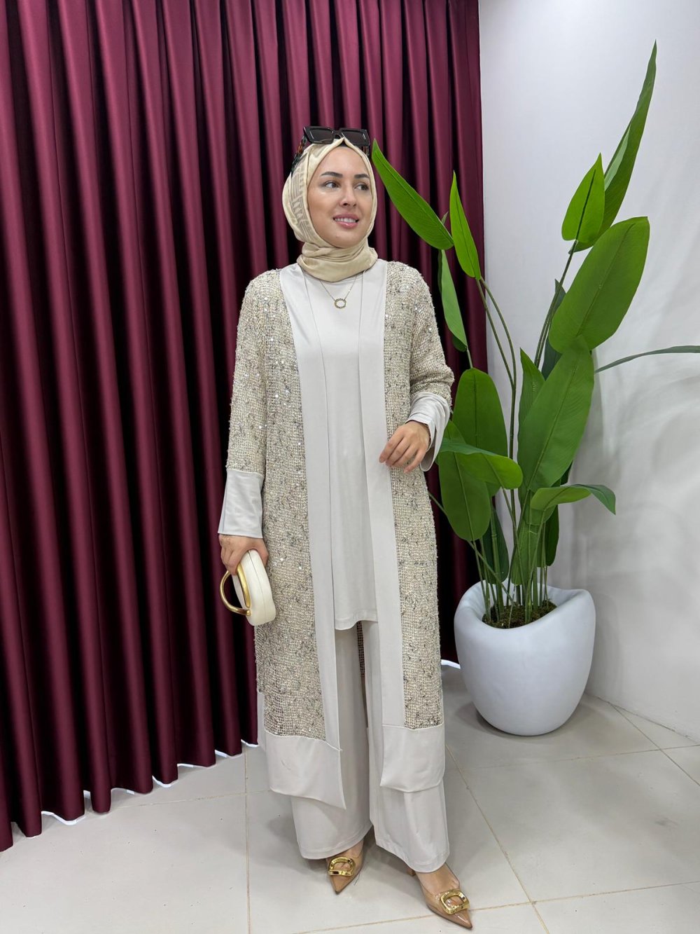 Payetli Hırkalı Takım Bej
