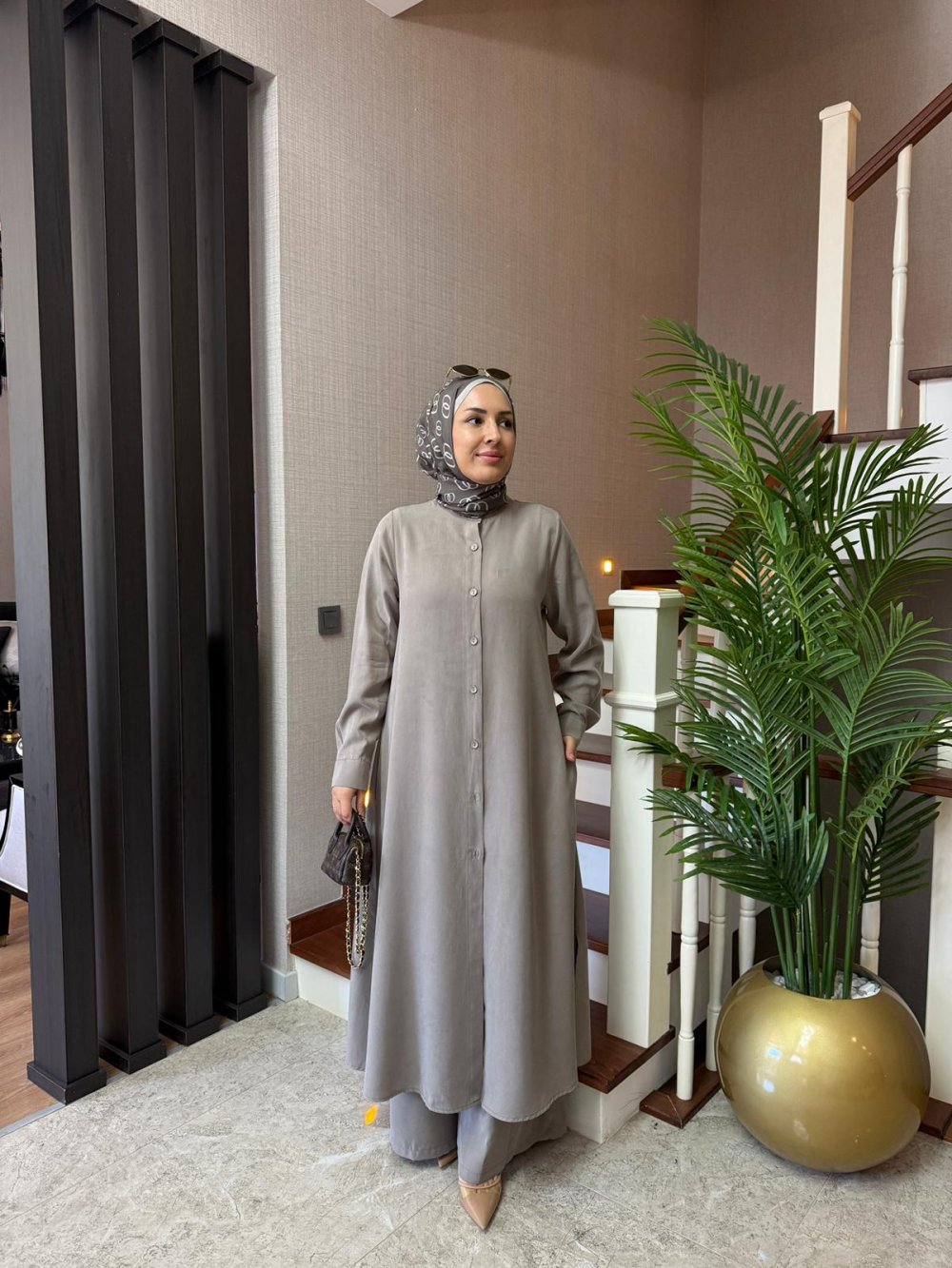 Tunik boy 125 cm’dir. Önden düğmeli, yanında cepleri ve yırtmaçları mevcuttur.